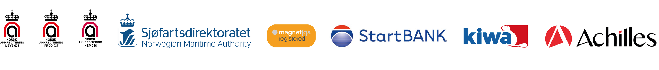 Vi er blant annet sertifisert som sakkyndig virksomhet for alle typer løfteutstyr og godkjent virksomhet type A-1, akkreditert systemsertifiseringsorgan, akkreditert inspeksjons- og sertifiseringsorgan innen akvakultur (NYTEK 23), og godkjent kontrollforetak for lasteskip og fiskefartøy mellom 8-15 meter.